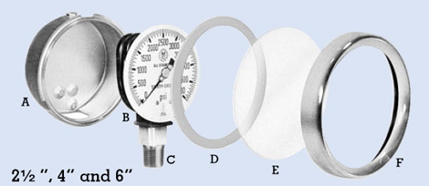 The best-known construction materials available are used in the manufacture of McDaniel gauges. A. 304 Stainless Steel Heavy Duty Case B. 316 Stainless Steel Heavy Duty Movement C. 316 Stainless Steel Heavy Duty Connection, Socket and Bourdon Tube D. Neoprene Gaskets E. Laminated Safety Glass Lens F. Polished 304 Stainless Steel Bayonet Ring G. Stainless Steel Blowout Assembly |